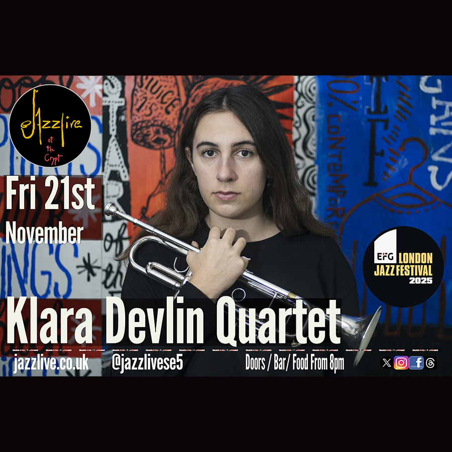19-year-old jazz trumpet player, Klara Devlin, was a 2024 BBC Young Jazz Musician finalist, currently studying jazz at the Royal Academy of Music. She began playing trumpet at five and discovered jazz at eight. Her quartet — formed through Tomorrow’s Warriors — performs her original compositions and arrangements inspired by bebop, blues and free jazz. The Klara Devlin Quartet has played at venues including Jazz In The Round, Jazz Sanctuary, Karamel, CLF Art Lounge, and, the Brick Lane, We Out Here and Brecon Jazz Festivals.