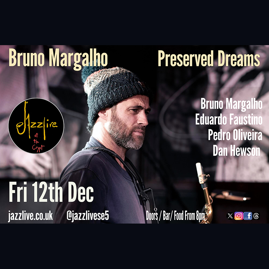 Portuguese saxophonist and composer Bruno Margalho presents music from his second album “Preserved Dreams”, leading a powerful group with Eduardo Faustino (electric guitar), Dan Hewson (piano) and Pedro Oliveira (drums). Expect contemporary jazz with strong melodies, rich textures and energetic improvisation.